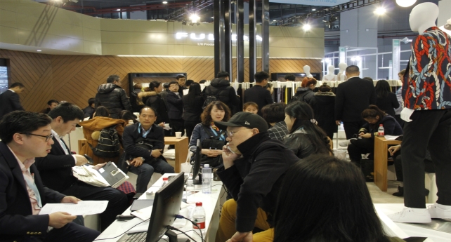 本次經貿平臺紡織面料展位位于博覽會6.1 E12館,將攜帶的紡織面料分成5個區塊。其中,新品面料和男裝成衣為一個區塊,爆款、現貨面料和成衣面料掛鉤為一個區塊,女裝成衣和交織男女面料為一個區塊,TR系列面料與男女裝成衣為一個區塊,天絲、針織、全滌、TR彈力面料為一個區塊。通過成衣與面料的交叉擺放,吸引了前來觀展客戶的目光,這種分區塊的展示,讓客戶更能了解富麗達紡織面料的特點與性能。本次經貿平臺展位上最大的亮點,就是對面料進行掃碼登記,摒棄了多年來業務員手抄面料編號的歷史,這次利用先進的面料二維碼掃描,快速地登記了客戶信息和客戶選中的樣品信息,縮短了選樣的時間,增加了與客戶的溝通時間,既維護了老客戶,又開拓了新市場。