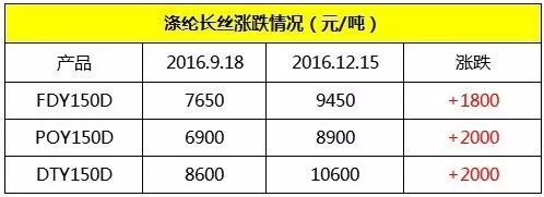 在石油輸出國組織(OPEC)承諾將產量削減120萬桶/日、產量上限設定為3250萬桶/日之后,我國滌綸長絲產品的價格可謂一路看漲。根據生意社監測,12月19日,國內滌綸長絲市場行情仍呈現走高態勢,廠家報價重心有所上調,尤其是滌綸FDY,主流工廠報價重心集中上調100元/噸。江浙地區主流工廠滌綸POY150D/48F報8610~9000元/噸,DTY150D/48F(低彈)報10150~10700元/噸,FDY150D/96F報9450~9700元/噸。