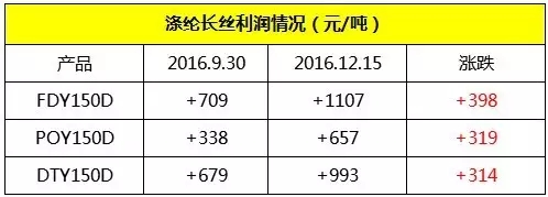 “滌綸長絲供需格局將會改變。”業內投資人預測表示,滌綸長絲行業的供需格局正發生深刻變化。滌綸行業的供需拐點出現在2015年,由于價格周期的拐點往往滯后于供需平衡的拐點,2016尤其下半年以來滌綸長絲景氣度提升、價格反轉的趨勢非常確定。產業鏈自 2011年以來“PX大賺,PTA、聚酯慘淡”的格局將會大概率改觀,產業鏈利潤最有可能向聚酯/滌綸長絲端轉移。”